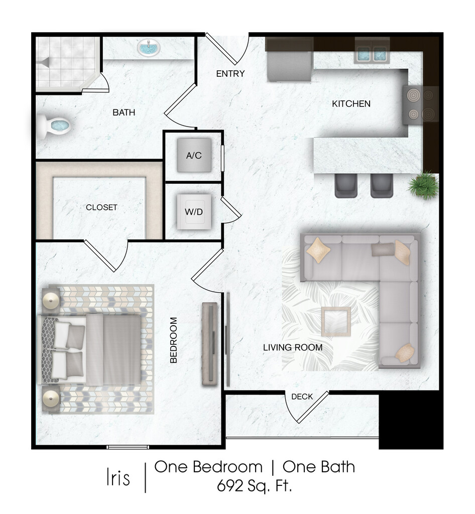 Price Availability Date Unit Sq Ft $1,050 Call for Availability Iris 692 sq ft Model Amenities and Features