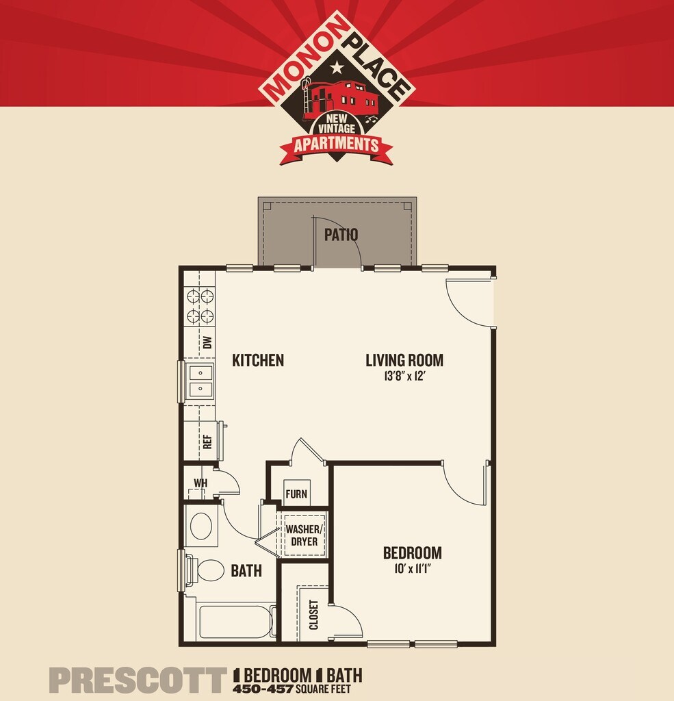 Apartment Model: Monon Place II - 1 BedroomFrom $1,1851 Bedroom, 1 Bath, 450 sq ftAvailable NowFloor plans are artist's rendering. All dimensions are approximate. Actual product and specifications may vary in dimension or detail. Not all features are available in every rental home. Please see a representative for details.