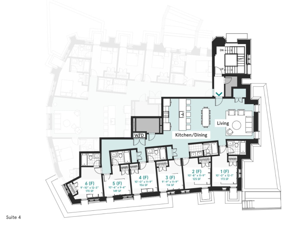Private Bed & Bath (6 Person Suite) - Floorplan 3 Private Bed & Bath (6 Person Suite) - 3D Tour Apartment Unit: 1-6Apartment Model: Private Bed & Bath (6 Person Suite)$1,3001 Bedroom, 1 Bath, 152 sq ftAvailable NowApartment Unit: 4-5Apartment Model: Private Bed & Bath (6 Person Suite)$1,1501 Bedroom, 1 Bath, 124 sq ftAvailable NowModel Gallery