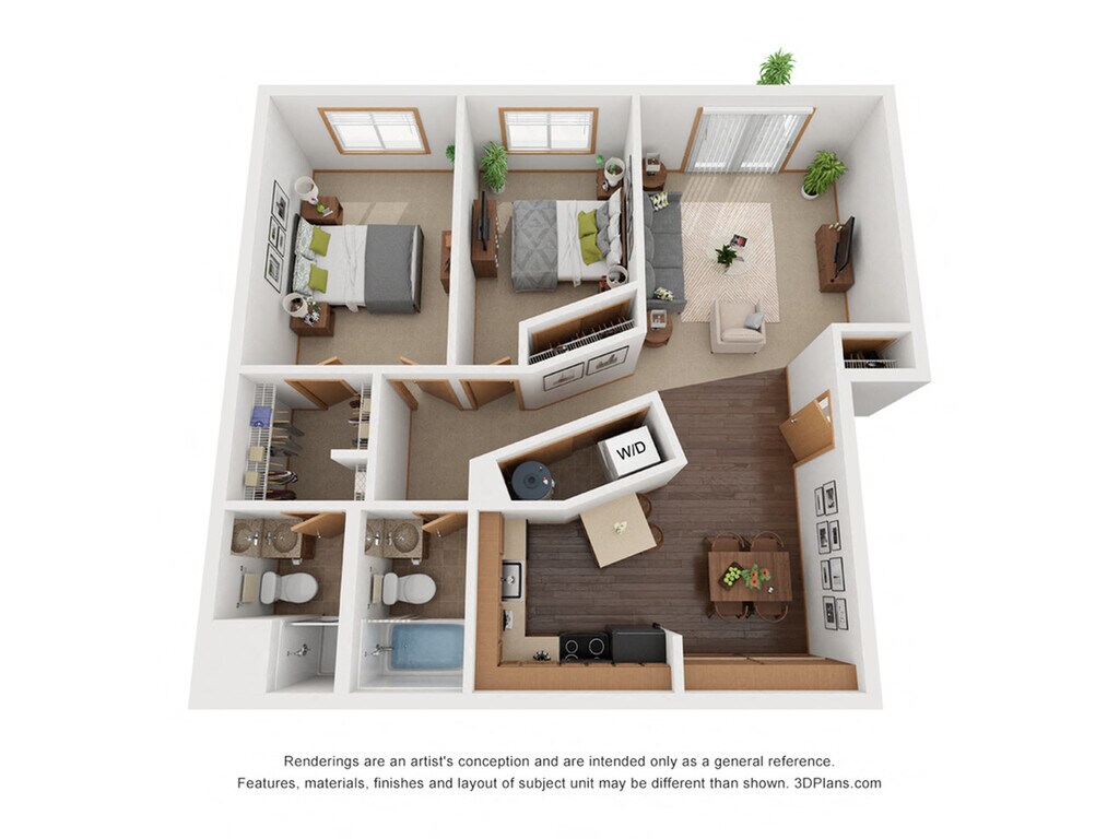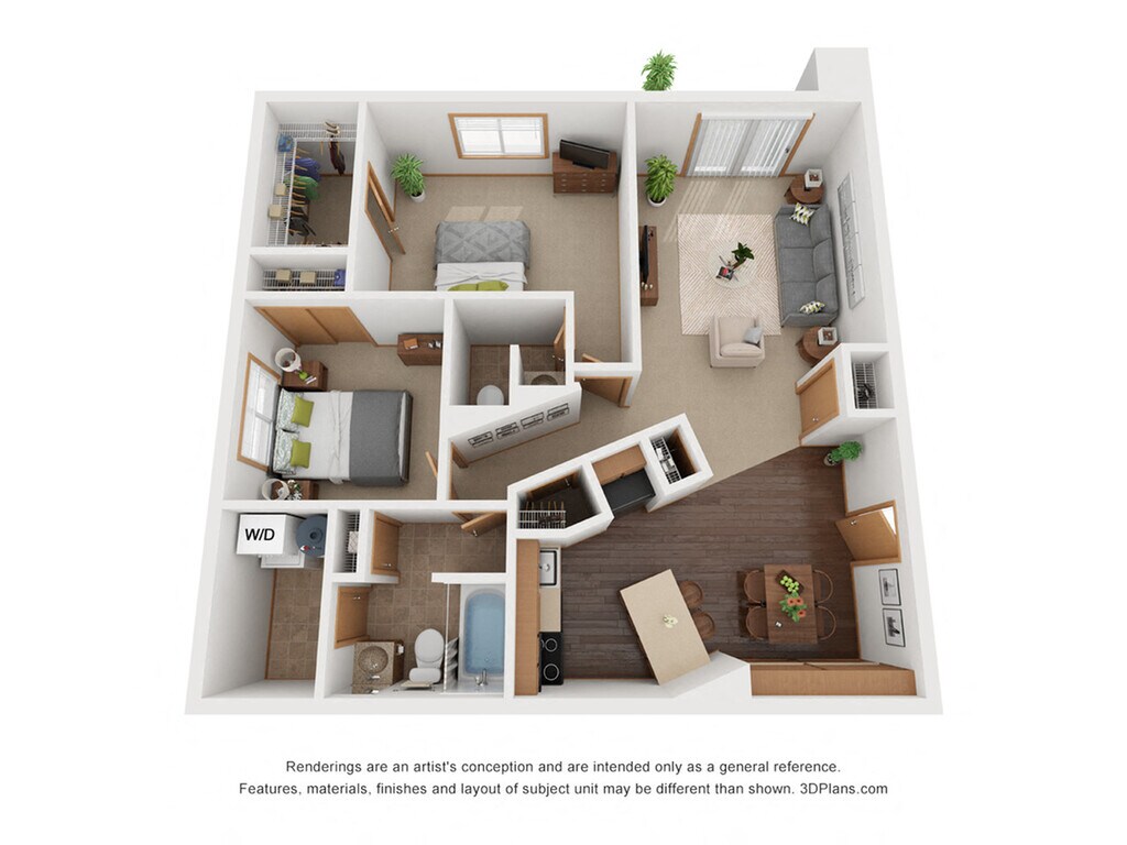 Two Bed Two Bath D - Floorplan 1 Apartment Unit: 2831-205Apartment Model: Two Bed Two Bath D$1,6652 Bedroom, 2 Bath, 1037 sq ftAvailable NowTwo Bed 1.5 Bath A