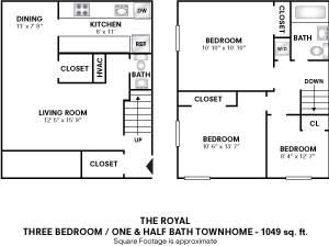 Three Bedrooms 1.5 Bath Townhome - 1,049 sqft