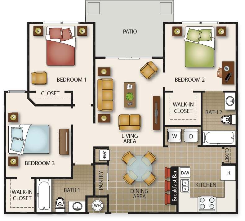 Apartment Model: Three Bedroom Two BathFrom $1,4493 Bedroom, 2 Bath, 1046 sq ftAvailable Now![]()