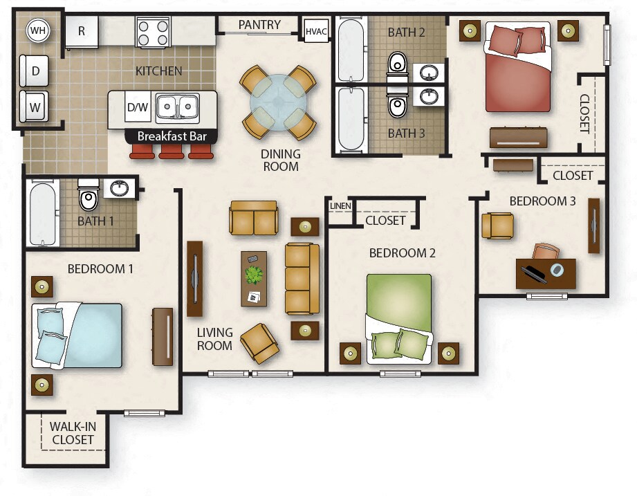 Three Bedroom Two Bath - Floorplan 1 Three Bedroom Two Bath (b)