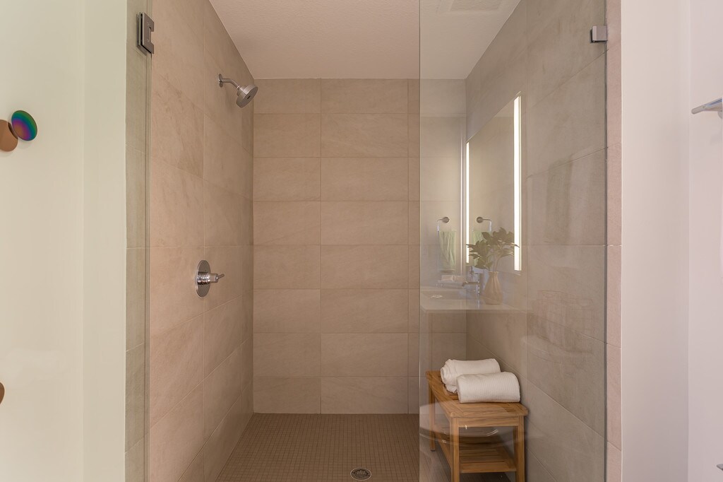 - Porcelain Tile Bathrooms with Frameless Glass Shower Enclosures
