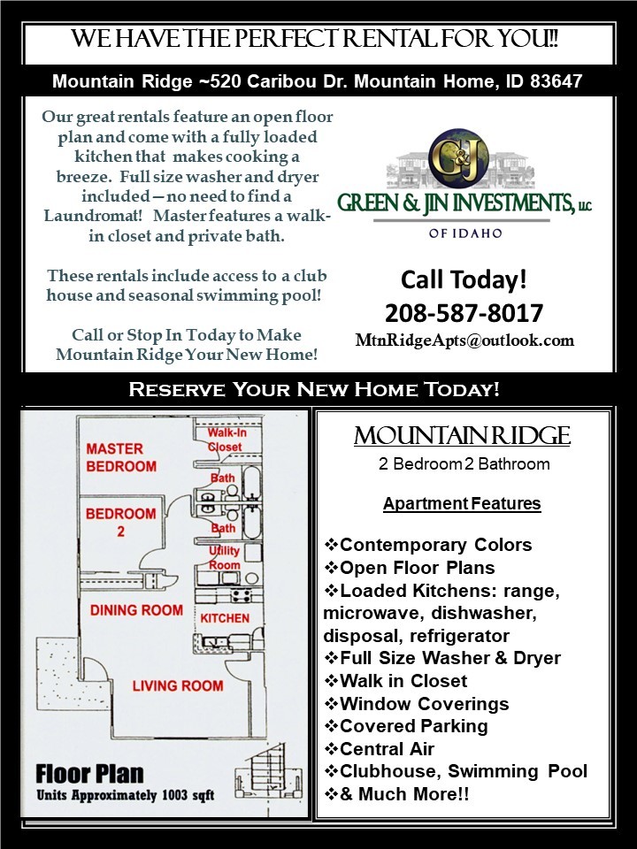 Mountain Ridge is located in the 83647 Zip code of Mountain Home, ID. This community is professionally managed by Green & Jin Investments; Llc