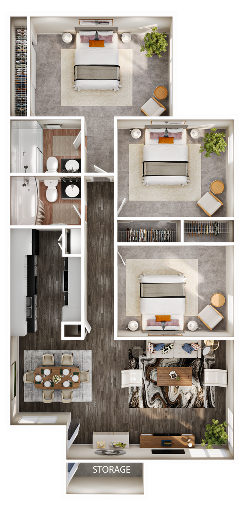 Copperwood - Floorplan 2 Copperwood - 3D Tour Apartment Unit: 0203Apartment Model: Copperwood$2,8762 Bedroom, 1 Bath, 912 sq ftAvailable Now3 Bedrooms
