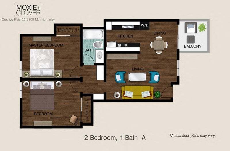 1 Bedroom to 2 Bedroom Apartments at Moxie + Clover currently range from $2,335 to $2,800
