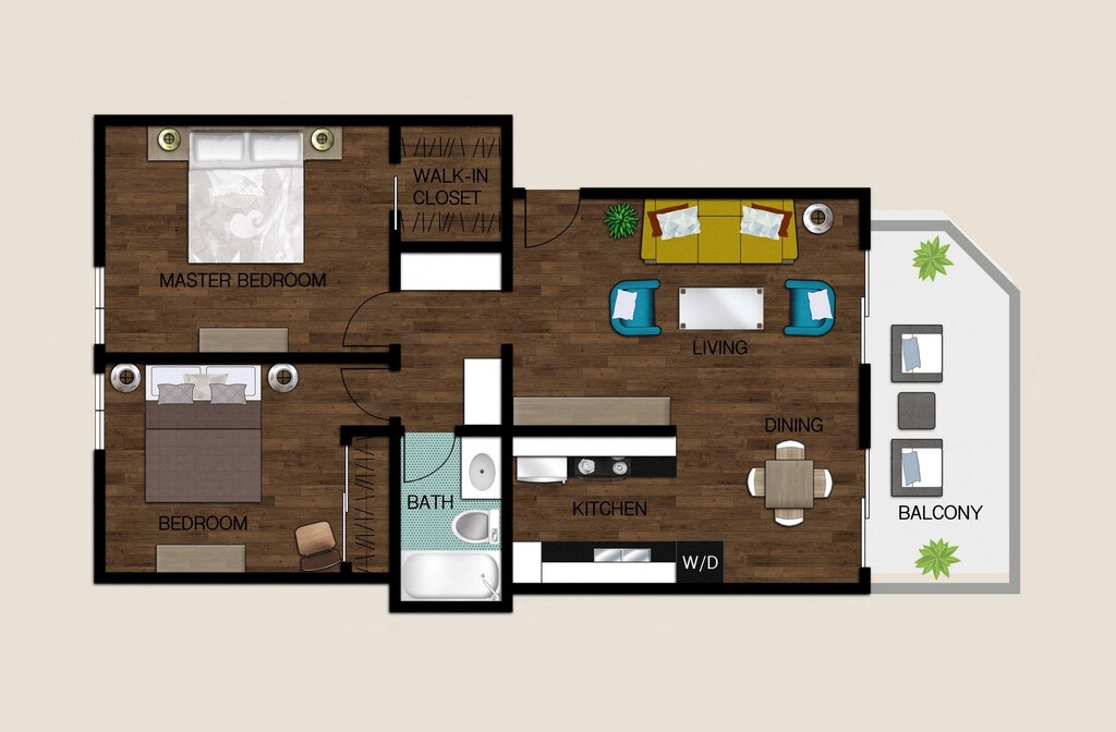 Two Bedroom - Floorplan 4 Apartment Unit: 212Apartment Model: Two Bedroom$2,8502 Bedroom, 1 Bath, 950 sq ftAvailable Now![]()