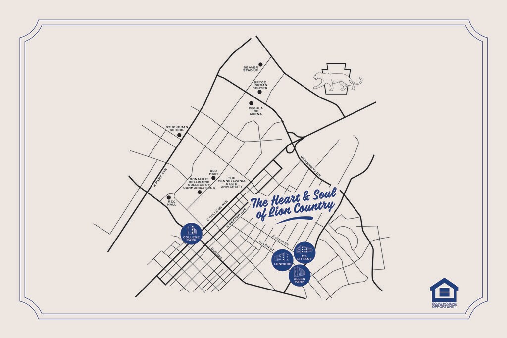 Mt. Nittany at Allen & Pugh is off Pugh Street with one- and two-bedroom units featuring a distinctive yellow brick exterior. A quieter retreat with its own bespoke study space and access to all shared amenities. Central HVAC, private bathrooms, and a warm industrial chic aesthetic.