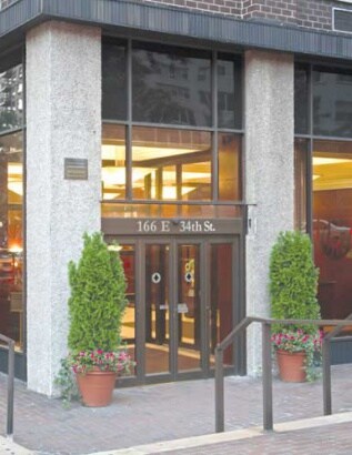 Located in the heart of midtown Manhattan in famed, tree-lined Murray Hill®, 166 East 34th Street is a 21-story luxury rental apartment house offering spacious studio, one, and two-bedroom apartments. Many of these dramatic homes offer spectacular East River and skyline views while several upper floor residences also feature real wood-burning fireplaces. Kitchens feature blond maple cabinetry with granite countertops and ceramic tile flooring. Additional design and comfort amenities include a beautiful new lobby; new public corridor lighting, carpet and wallpaper, new thermopane windows and the complete modernization of the building’s elevators. A new intercom security system was installed and the wiring was upgraded to provide tenants with multiple cable television, telephone and high speed Internet access choices. The building offers the security of a 24 hour doorman and an attended garage.