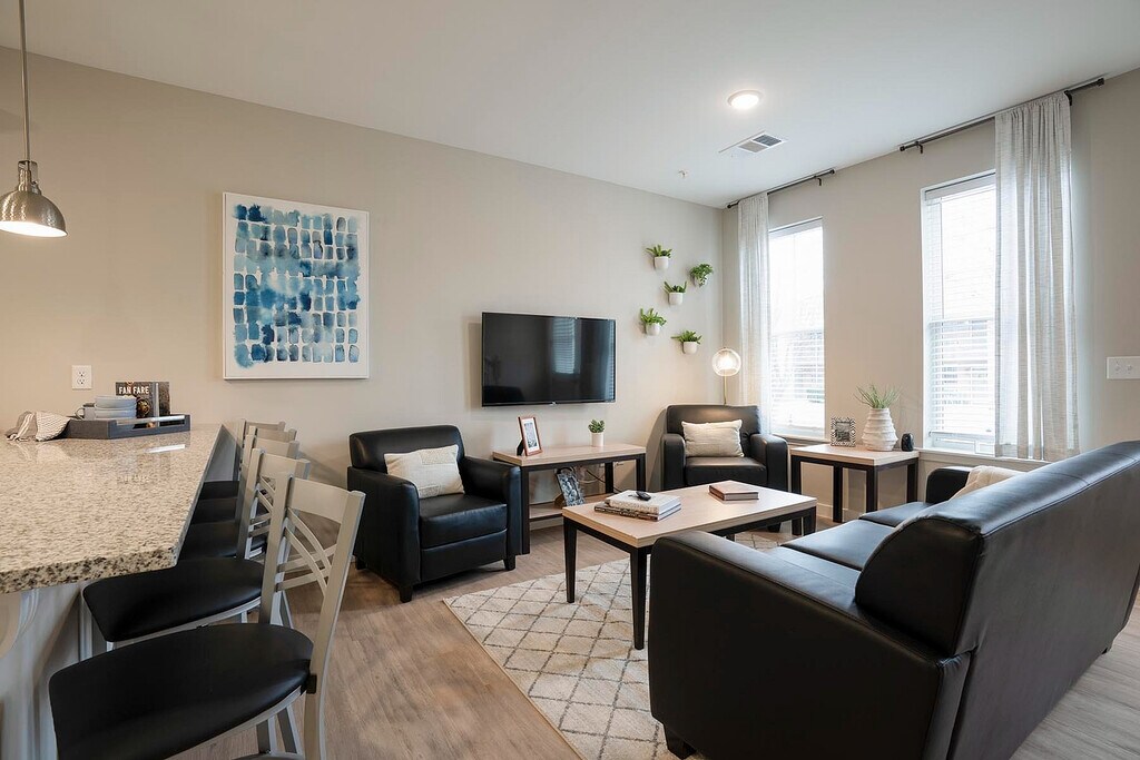 At My House on 13th, enjoy the convenience of student living less than a mile from the UA campus - just a 15-minute walk away! Our student residents can easily walk, bike, or drive to class. Check out our off-campus student apartments in Tuscaloosa, AL, featuring 4- and 5-bedroom townhomes! My House on 13th's 4- and 5-bedroom off-campus apartments near UA feature an upscale furniture package that includes a full-sized bed, desk, desk chair, and an under-bed dresser. The living area comes complete with a leather couch, chair, end table, coffee table, barstools, flat-screen TV, and entertainment stand. Schedule a tour today to see one of the best student living options near UA.