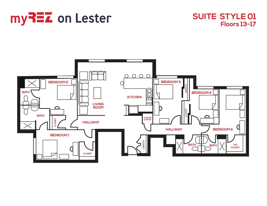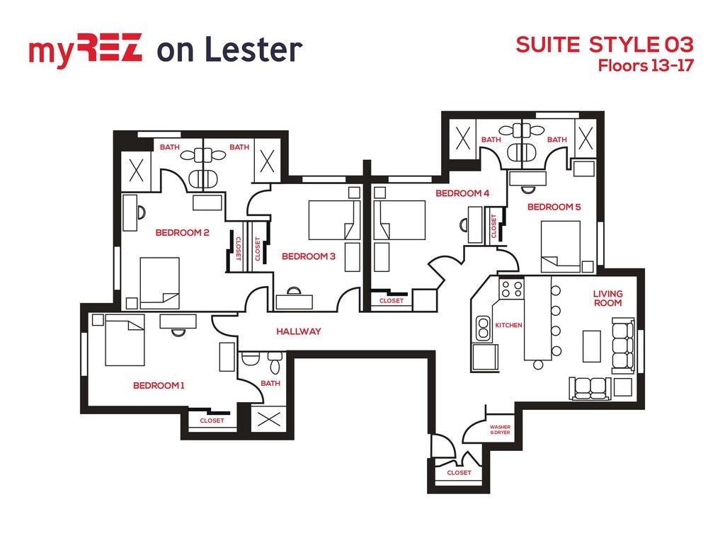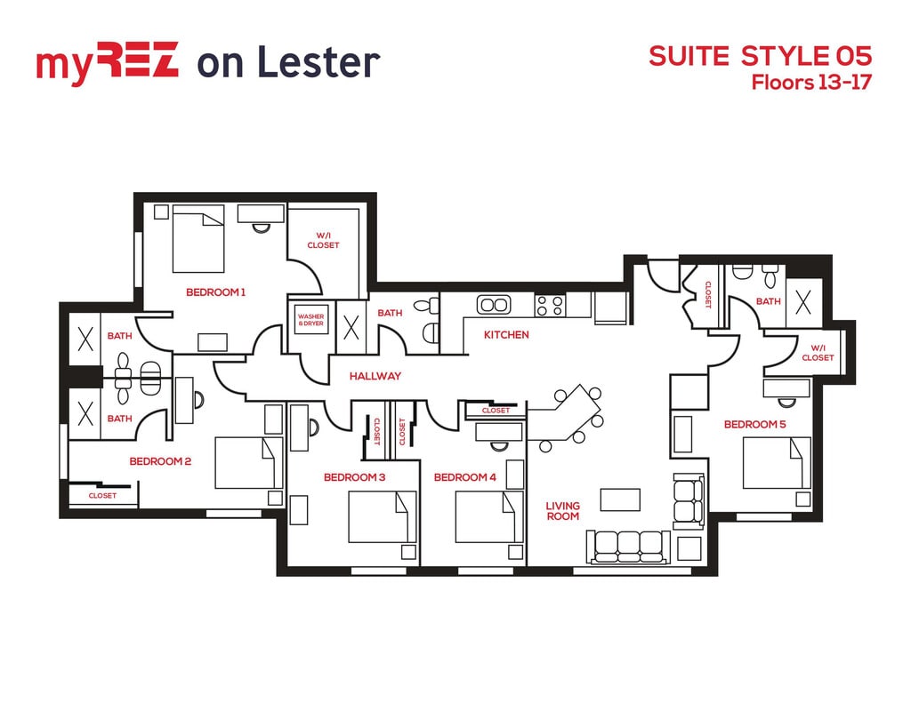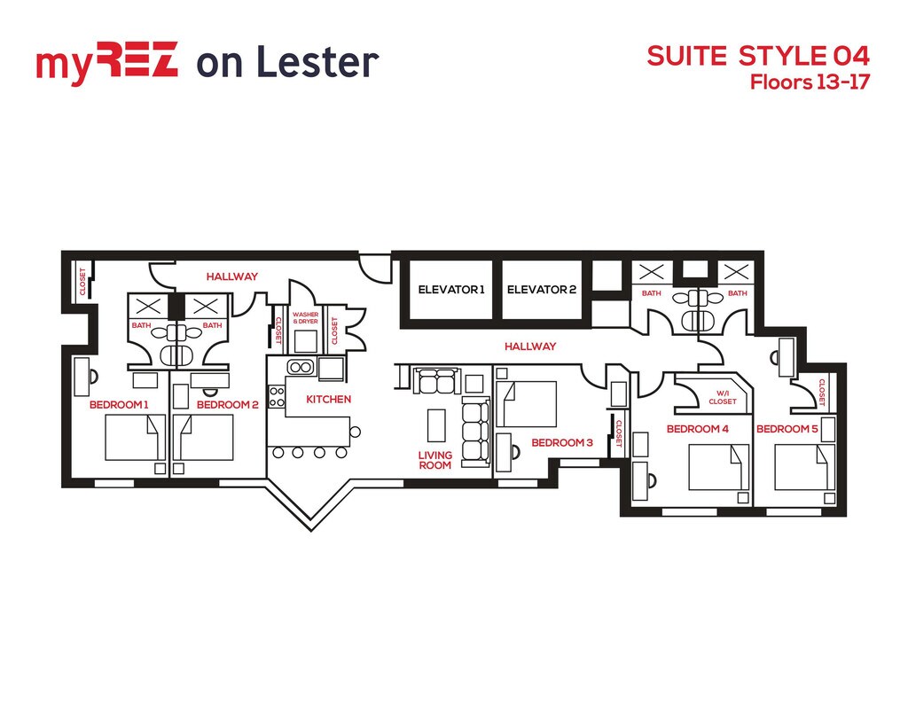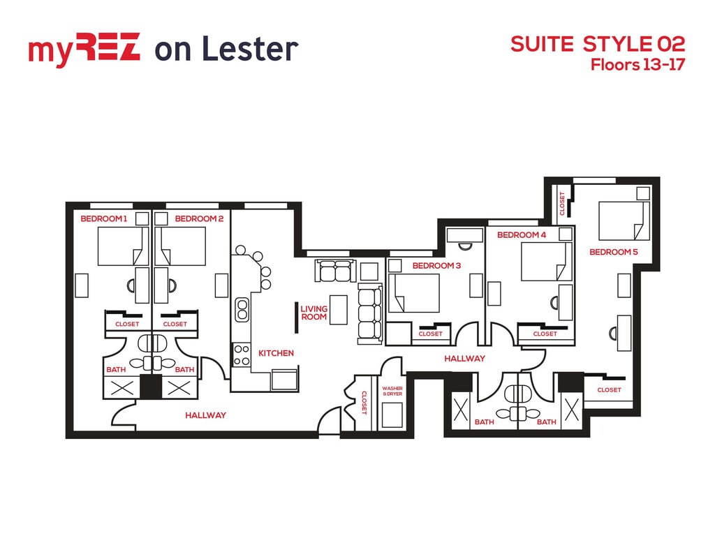 MyRez On Lester - Student Living offers 5 Bedroom apartments starting from $450 and having 1,429–1,763 sq ft. Here is the current pricing and availability: