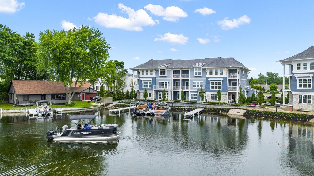 Presenting the Crescent on Lake Orion Where Living is a Vacation. This stunning two-bedroom townhome with a boat slip offers the perfect blend of modern elegance and waterfront charm. Enjoy breathtaking sunset lakefront views and the convenience of having your own individual boat slip. With a private entrance, covered front porch, and private balconies, you can truly immerse yourself in the beauty of the all-sports lake. Inside, you'll find a spacious, open floor plan with quartz countertops, designer kitchen, stainless appliances, and double sink vanities. The primary ensuite bathroom and walk-in closets add a touch of luxury to this coastal cottage-inspired home. Now available for those looking to experience the Village of Lake Orion lifestyle. Don't miss out on this opportunity to live in a truly exceptional lakeside retreat.