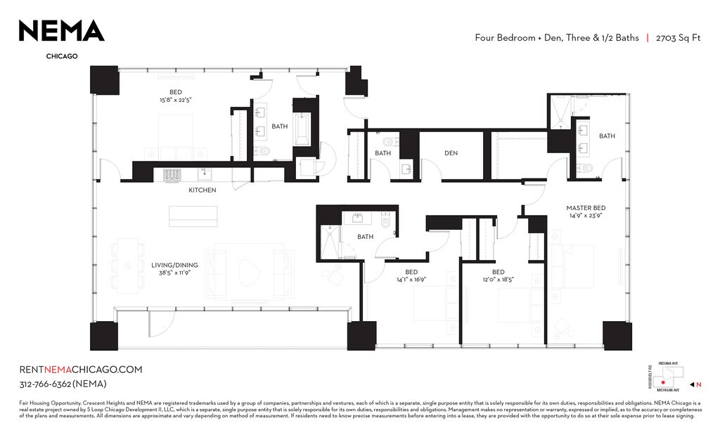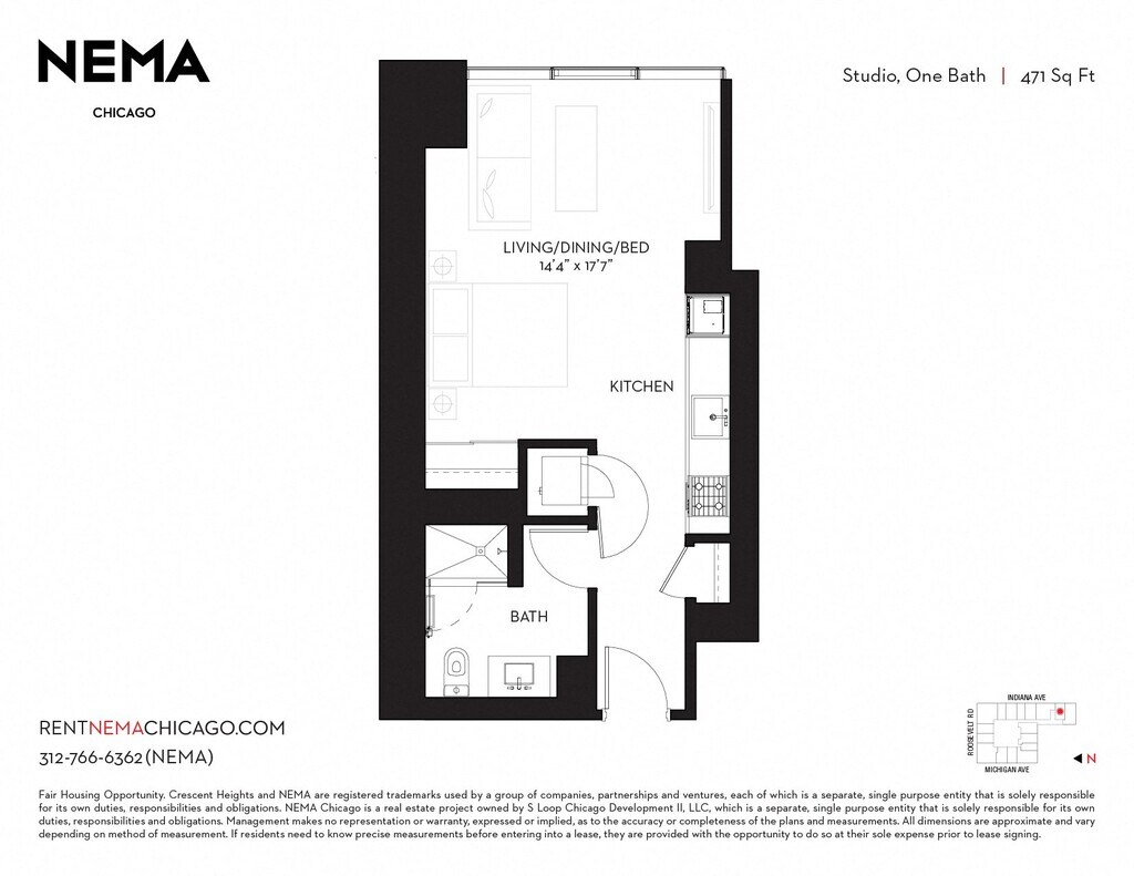 NEMA Chicago offers Studio to 4 Bedroom apartments starting from $2,408 and having 471–2,703 sq ft. Here is the current pricing and availability: