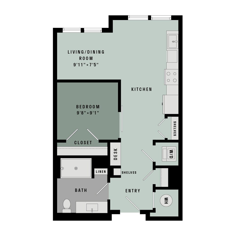 Apartment Model: S4From $1,475Studio, 1 Bath, 624 sq ftAvailable NowFloor plans are artist's rendering. All dimensions are approximate. Actual product and specifications may vary in dimension or detail. Not all features are available in every rental home. Prices and availability are subject to change. Base rent is based on monthly frequency. Additional fees may apply, such as but not limited to package delivery, trash, water, amenities, etc. Deposits vary. Please see a representative for details.