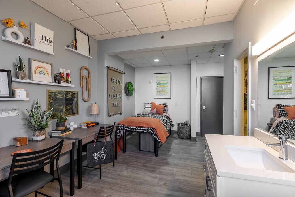 Naismith is a student housing complex located on The University of Kansas campus. Naismith puts you just steps from specialty major buildings such as Capitol Federal Hall, Murphy Hall, and Robinson Center and across the street from Allen Fieldhouse. Our all-inclusive living experience provides you with everything you need and more while in college or moving to LFK. We offer some of the largest room sizes compared to residency halls at KU with each of our one or two-person floorplans. In addition, we have a dining hall located right inside Naismith open all year, 7-days a week, 3 meals a day, included in your rental rate! But the perks are what make Naismith the place to be. With the interior and exterior renovation of all of our amenities and units, you and your friends are going to want to call Naismith home. Our construction plans include upgrades to the dining area, communal kitchens, one-of-a-kind fitness area, lounges and study rooms on each floor, upgraded business center, a fresh look to this new Naismith and so much more. *PRIVATE ROOM ADDITIONAL FEES APPLY*