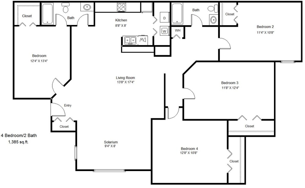Apartment Model: Four Bedroom4 Bedroom, 2 Bath, 1305-1385 sq ftAvailable January 1, 2026![]()