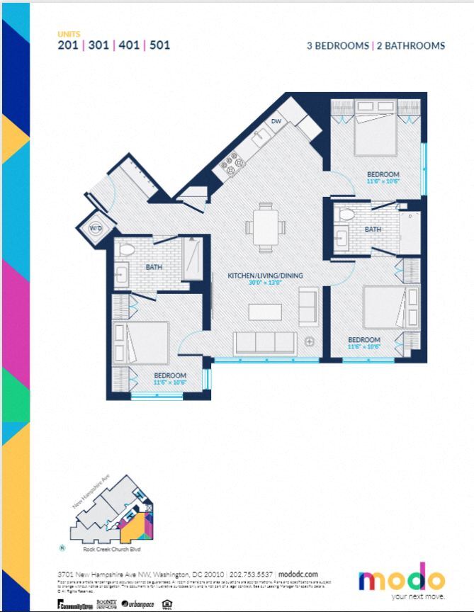 MODO is a brand new boutique building steps from the Petworth Metro featuring all 3 bedroom apartments with roomy living, dining and communal areas and top of the line finishes. Featuring custom built-in cabinets, closets and abundant storage. All homes come with an installed jumbo flat screen TV. Amenities include a roof terrace with a bar, ample seating areas, grilling station and Monument views. The penthouse media lounge room is perfect for gathering with friends or working remotely with many seating areas and bar area options. Package/delivery room and secure entry access.