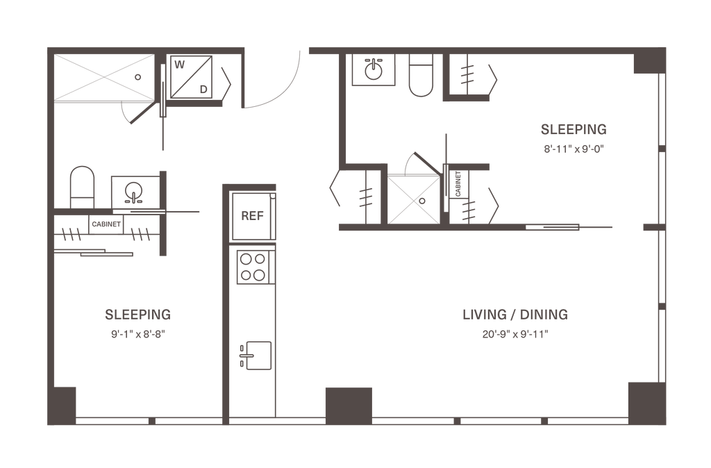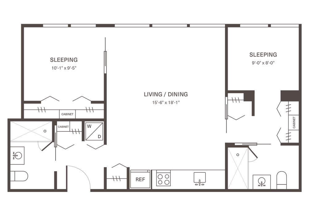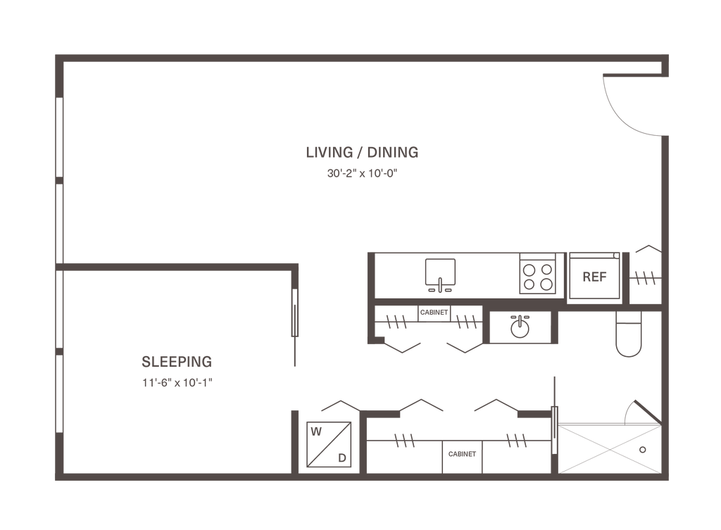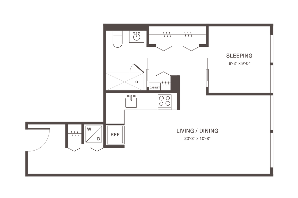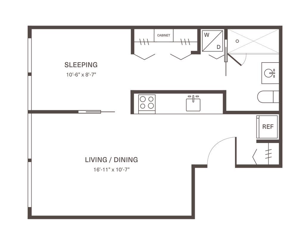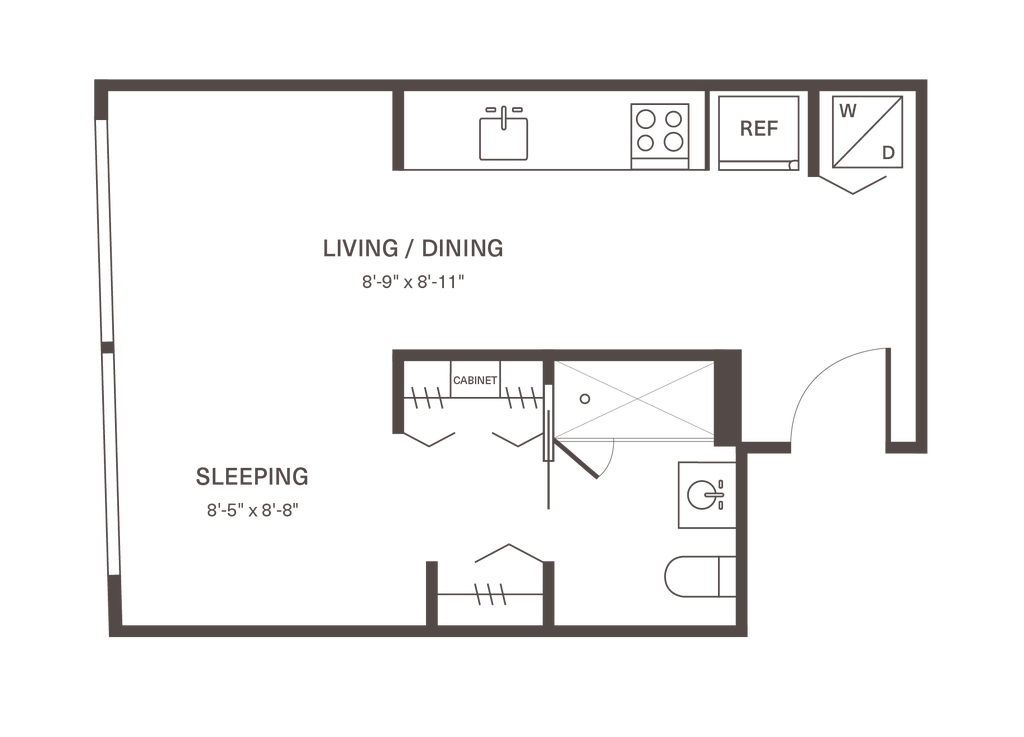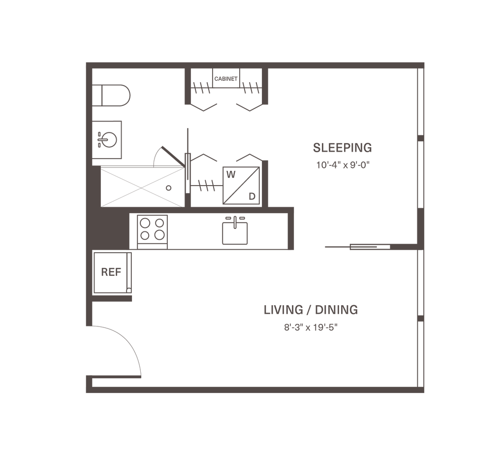 S1A - Floorplan Apartment Unit: 155-202Apartment Model: S1AFrom $2,315Studio, 1 Bath, 439 sq ftAvailable May 5, 20261 Bedroom