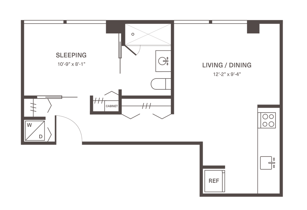 M12 - Floorplan 1 Apartment Unit: 155-205Apartment Model: M12From $2,0411 Bedroom, 1 Bath, 514 sq ftAvailable NowFloorplan M9