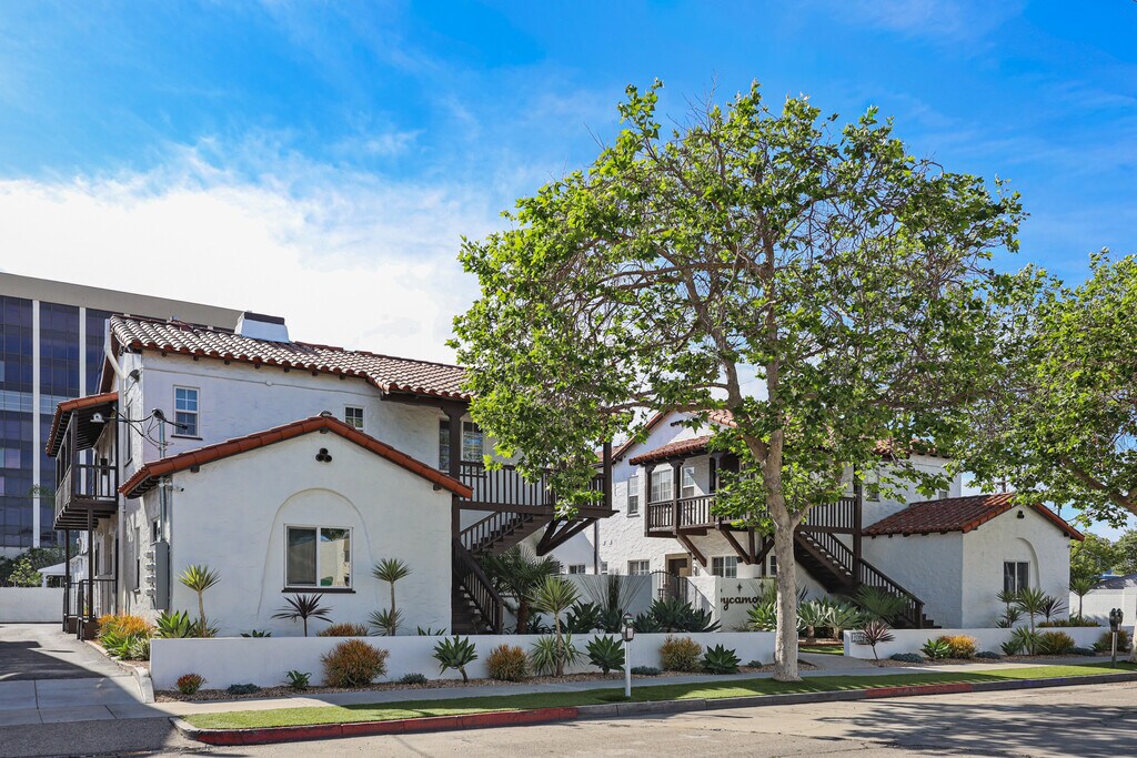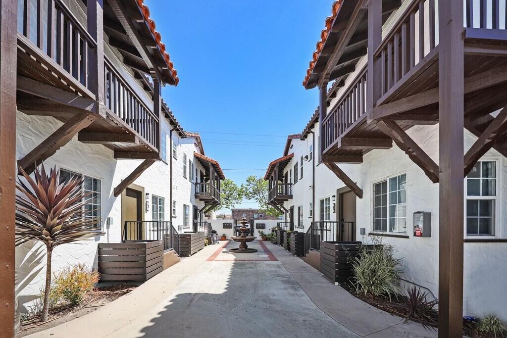 Drake Real Estate Group | Welcome home | Schedule your private viewing | Inspired by Mediterranean and Spanish Revival-style architecture and enhanced by deep red tones and polished wood textures that contrast with stark white walls, these classic restored Santa Barbara-style rental homes are just minutes to thriving Downtown Santa Ana. 1524-1530 North Sycamore Street, located in the heart of Santa Ana’s historic Willard neighborhood, features two side by side, four-unit, two-story low-rise buildings with Santa Barba style architecture. This charming, gated community features a calming water fountain in the courtyard, private entryways, balconies, red tile roofs, and remote-controlled garage parking. Carefully restored and designed by a renowned LA designer, these 1920s vintage luxury rental homes feature keyless entry door locks to spacious one bedroom and two-bedroom floor plans with arched entry ways to newly renovated kitchen and bathrooms. The kitchen boasts sparkling white stone quartz countertops with brand new self-closing cabinetry and high-end Samsung stainless-steel refrigerators with matching gas cooktop with oven and microwave. Stacked washer and dryers included inside each rental home with porcelain tiled bathtubs, and glass shower doors and separate guest bathrooms. Each rental homes also includes central A/C cooling and heating with recessed lights with luxury style remote control blinds and distressed wood plank floors. Minutes off the 5 Freeway on the 17th Street exit and nestled in the historic Willard area of Santa Ana and adjacent to French Park - an area known for its Victorian homes. The community is minutes to Downtown Santa Ana - the rapidly gentrifying area known for its eclectic eateries and elevated dining, fantastic night life, shopping and a host of other activities. 1524 North Sycamore Street has a Walk Score of 90 out of 100.