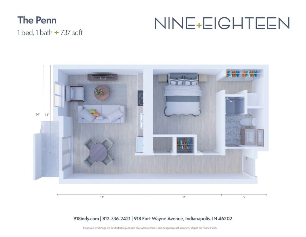 Apartment Model: The Penn$1,3271 Bedroom, 1 Bath, 737 sq ftAvailable Now![]()