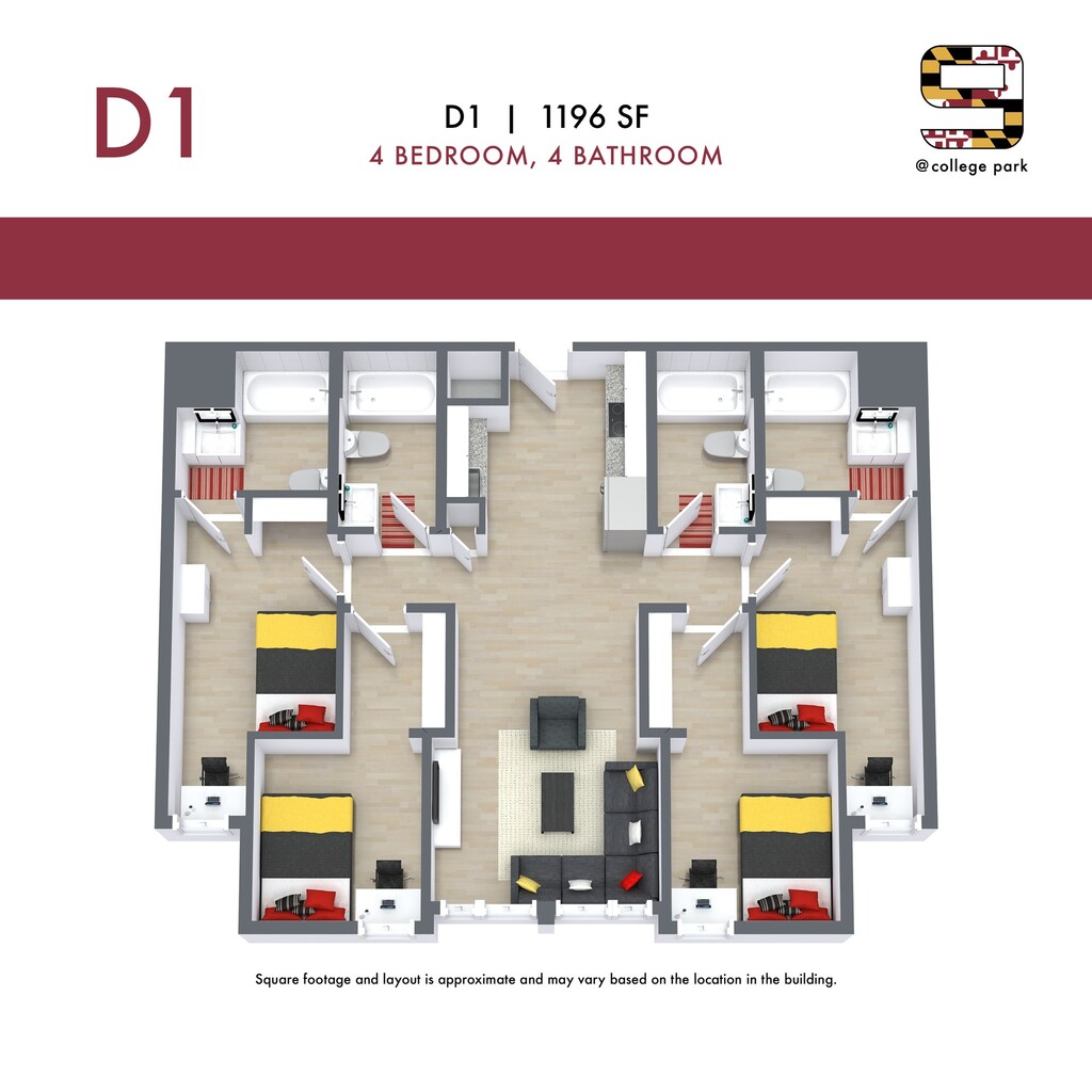 Apartment Model: D1$1,0594 Bedroom, 4 Bath, 1196 sq ftUnavailable![]()