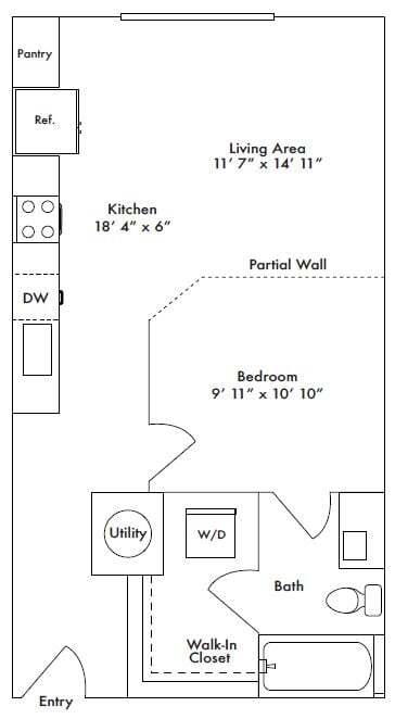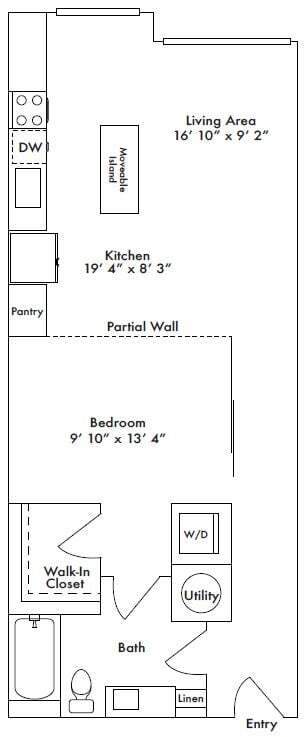 Apartment Model: S1From $1,345Studio, 1 Bath, 585 sq ftAvailable NowFloor plans are artist's rendering. All dimensions are approximate. Actual product and specifications may vary in dimension or detail. Not all features are available in every rental home. Prices and availability are subject to change. Base rent is based on monthly frequency. Additional fees may apply, such as but not limited to package delivery, trash, water, amenities, etc. Deposits vary. Please see a representative for details.
