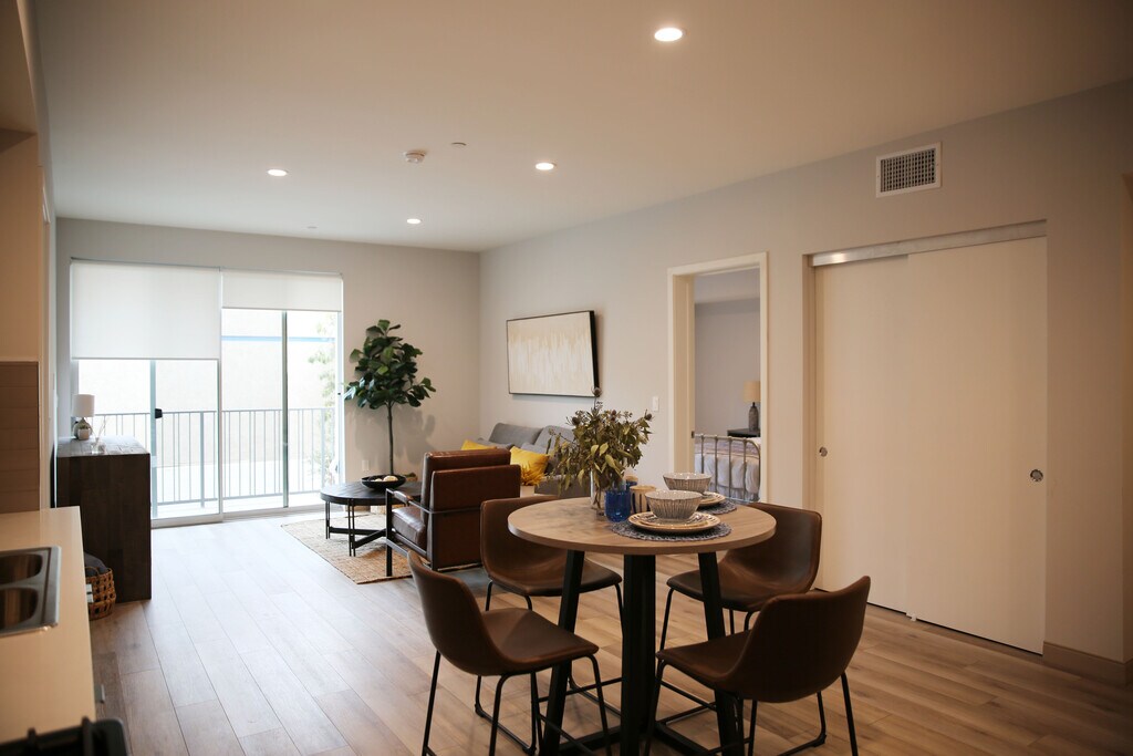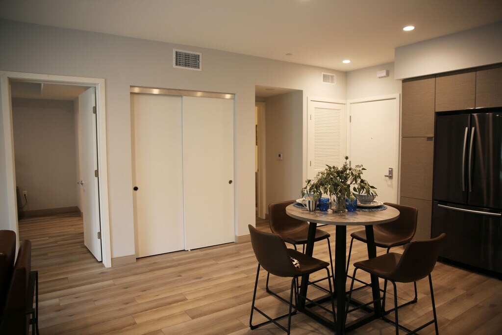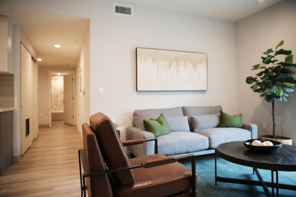 Welcome to NOHO Contemporary Apartments (“NCA”), NOHO’s premiere 42-unit apartment building without exception. Located on a quiet street (10925 Hartsook Street), NCA is ideally located within a five- minute walk of the NOHO business district on Magnolia which features all the fabulous restaurants, shops, galleries, theaters and studios that has made NOHO one of Los Angeles most desired places to live. Should you feel like frequenting other parts of the City and want to avoid LA’s traffic, the NOHO Metro Line is also but a short stroll away. But, it’s not just our ideal location on a quiet street that separates us from the competition; rather, it is the building itself that is designed and constructed to condominium specifications that makes us further unique. At first glance, you will note our apartments are appreciably larger than our competition. By example, our two- bedroom units have two master suites with double the closet space of other newly built apartments. Furthermore, our three bedrooms have 2.5 to 3 full baths and some even include a den or office that could be used as a fourth bedroom. How did we accomplish building such larger units than our competition? Simply put, California law allows a developer to build up to 35% additional units and reduce parking requirements if they set aside a percentage of apartments as affordable units. Obviously, if you jam 35% more units into the same space, the size of a typical unit will be 35% smaller. We elected to forego the density bonus and build first class units with state- of- the- art kitchens, custom cabinetry, quartz stone countertops, full tile back splash, state of the art appliances with double the storage space of our competition. We further included washers and dryers in every unit, large functional balconies, smart home features, and high- end faucets and fixtures. But there’s more to NCA than just grand apartment units. We have also included common area appointments which tenants in today’s environment find most useful. These include: • A top-of-the line Fitness Center that is centrally located and below the Sun Deck. • Surrounding the Fitness Center are two expansive courtyards appointed with BBQ’s lounge like seating. • Our community Mezzanine is a covered lounge, but open-air should you or your small group wish to watch a show, sporting event or movie on our large screen TV. • Our rear yard shall provide for a Dog Run, but we ask you to be responsible for its cleanliness. • The Mail Room is much more than just that. We have provided for package deliveries in privately controlled lockers that is APP sensitive. Even food can be delivered to a refrigerated locker. • Every apartment has two tandem parking spaces dedicated to it and we will provide 17 spaces with the latest charging station to accommodate electric vehicles. • Furnished units are offered upon request. Speak with our leasing agent for more details.