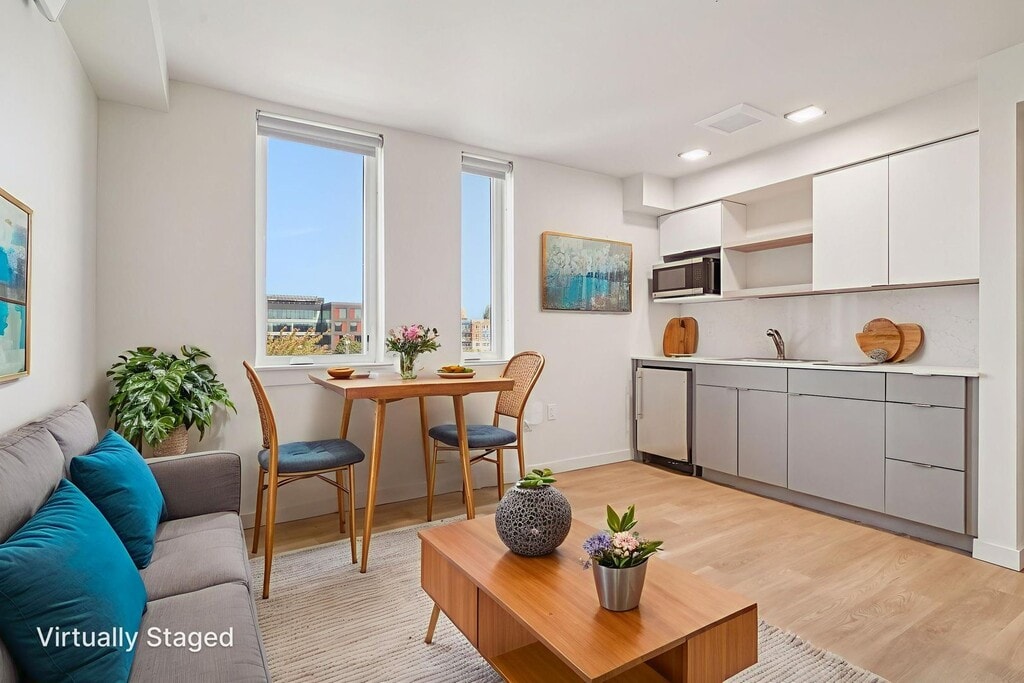 Welcome to Nordic Tower, a brand-new multifamily property at 1446 NW 53rd St, Seattle 98107! Built in 2024 in vibrant Ballard, this modern building offers 56 studio and one-bedroom units. Each home features in-unit laundry, air conditioning, heating, stainless steel appliances, quartz countertops, and some even boast heated bathroom floors, high ceilings, and designer finishes like concrete or luxury vinyl plank floors. Enjoy stunning 360-degree views from the expansive roof terrace and lounge. Work from home in the lobby with a communal co-working table and private office spaces. Other amenities include 24-hour package lockers, bicycle storage, and an elevator. With a "Walker's Paradise" Walk Score of 97 and a "Biker's Paradise" Bike Score of 97, daily errands are easy. Public transportation is steps away, offering quick access to Downtown Seattle and the University of Washington. Experience Ballard's unique blend of "small-town feel with city convenience," surrounded by diverse restaurants, coffee shops, bars, shops, and grocery stores. Plus, you're close to beloved parks like Green Lake. Nordic Tower offers modern Seattle living at its finest, combining stylish residences with unparalleled accessibility and a thriving neighborhood atmosphere.