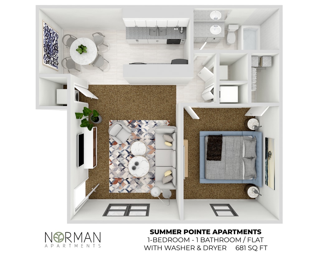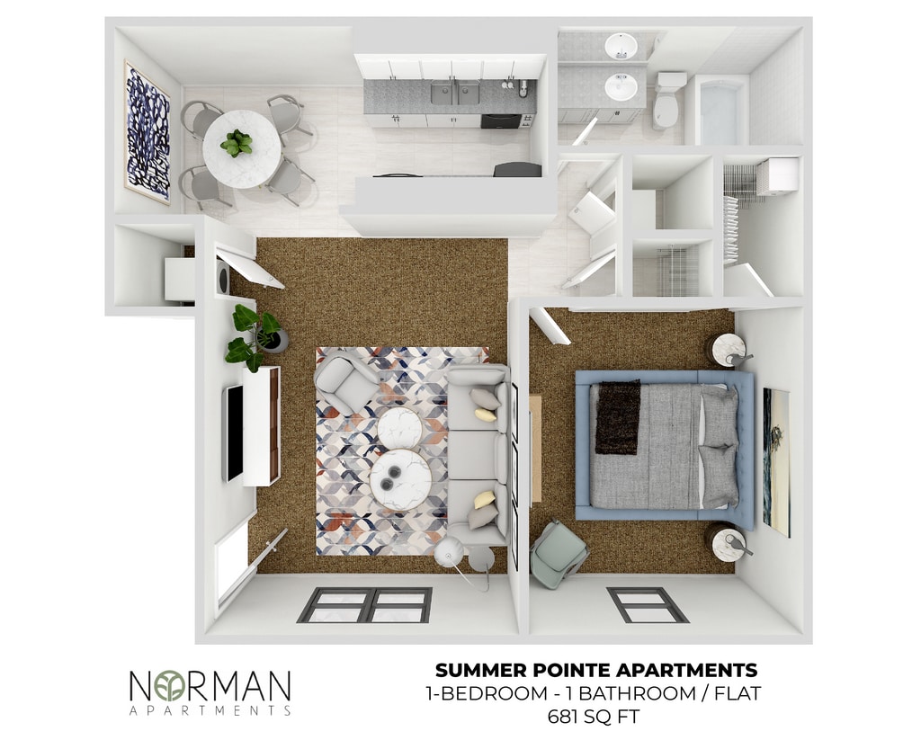 Apartment Model: 1-bed flat at Summer Pointe$9111 Bedroom, 1 Bath, 681 sq ftAvailable NowFloorplansPhotos![]()