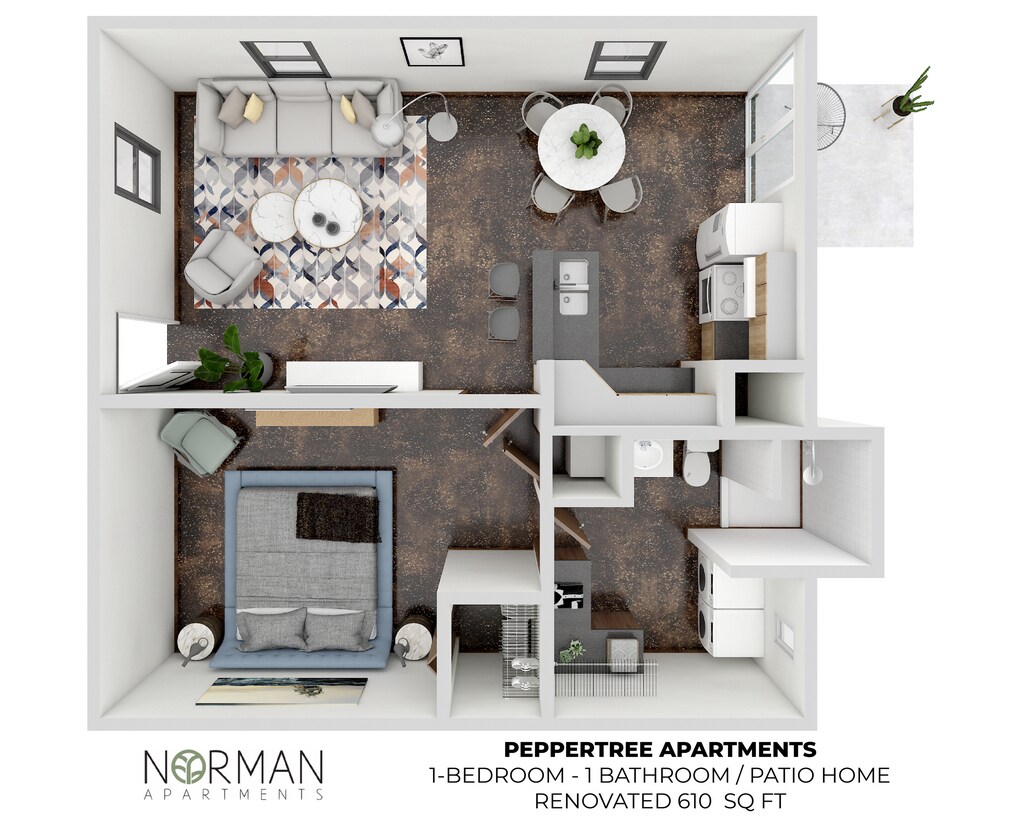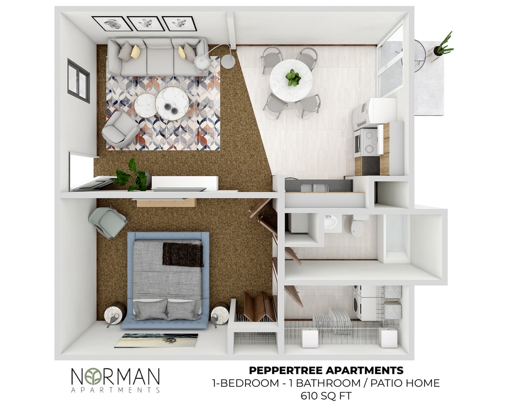 Apartment Model: 1-bed patio home at Peppertree$8721 Bedroom, 1 Bath, 610 sq ftAvailable NowFloorplansPhotos![]()
