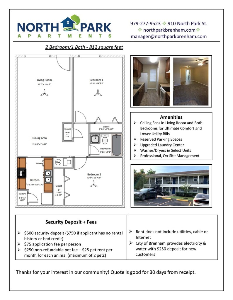 North Park Apartments is a quaint, 26-unit residential complex near Historic Downtown Brenham. Located at 910 North Park St., the community is adjacent to the beautiful Henderson Park and across the street from Fireman’s Park, which features an elaborate children’s playground, antique carousel, skate park and Brenham’s Nancy Carol Roberts Memorial Library. North Park Apartments is minutes away from HEB, Walmart, Starbucks, Blinn College and the retail hubs of Brenham. Also, Blue Bell’s ice cream parlor is just down the road! North Park offers 1 Bedroom/1 Bath units with 618 square feet and 2 Bedroom/1 Bath units with 812 square feet - all of which have plenty of closet space. Recent apartment upgrades include vinyl wood plank flooring, new carpeting, fresh paint, ceiling fans in living room and bedrooms, two-inch faux wood blinds, high-arc kitchen faucet and updated light fixtures. We provide on-site, professional management; on-site laundry facilities; reserved parking spaces; surveillance cameras; prompt response to maintenance requests; and a monthly prize drawing for early rent payers. Call us today to find your new home!