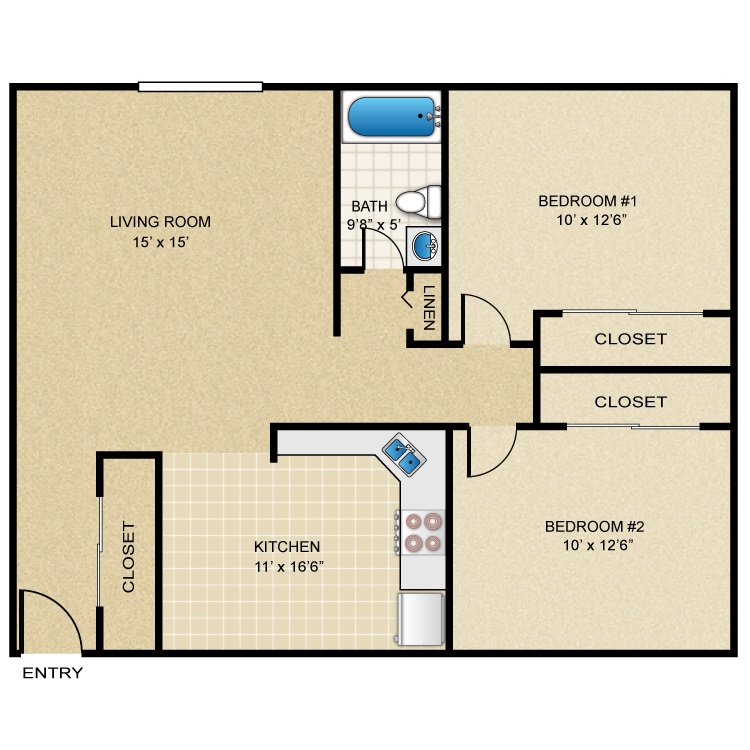 Apartment Model: Two Bedroom One BathFrom $1,3512 Bedroom, 1 Bath, 850 sq ftAvailable Now![]()