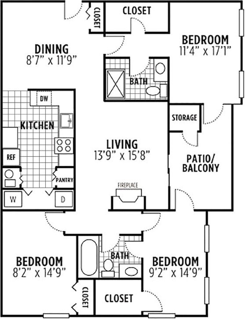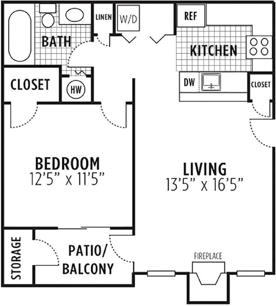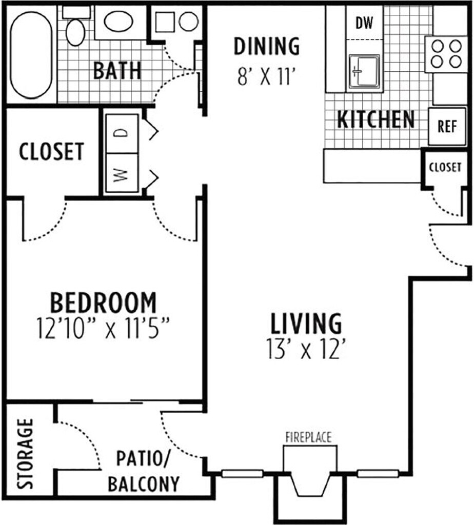 A2 Floorplan is an 827 square foot, One-Bedroom and One-Bathroom apartment. This layout features an open living area with a wood burning fireplace and an open dining area with a bar off the kitchen. The bedroom includes a spacious walk-in closet and access to your private patio/balcony, which offers adjoining storage. Additional conveniences include an in-apartment washer/dryer, abundant storage, and a dishwasher. *Please ensure that your anticipated move-in date does not exceed 14 days from the selected apartment's "Available On" date in order to proceed with your application. Additional lease terms may be available. Please contact our leasing team directly for assistance. *Security deposits may vary depending upon qualification.