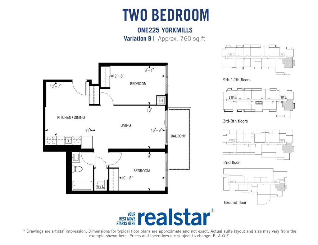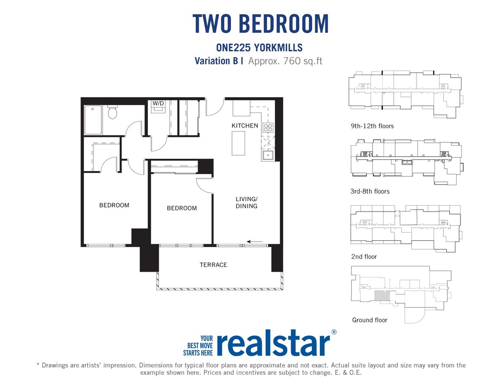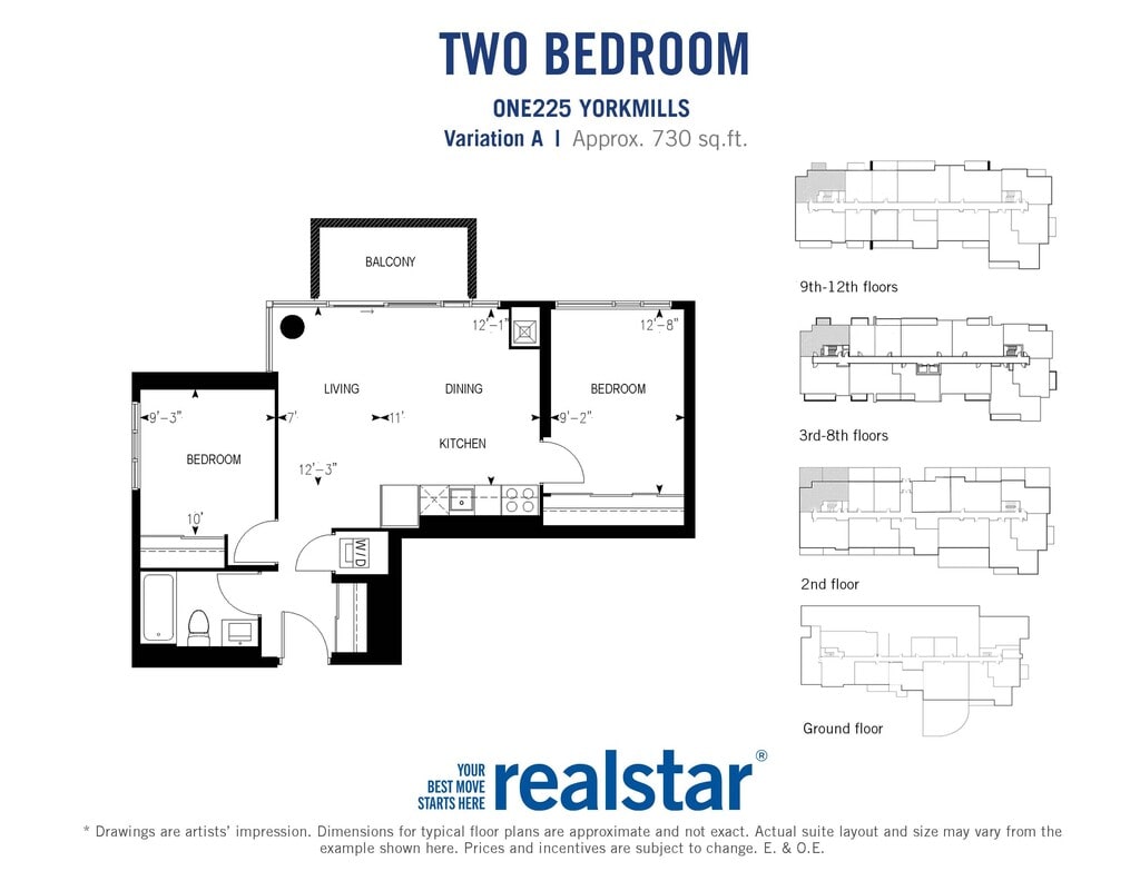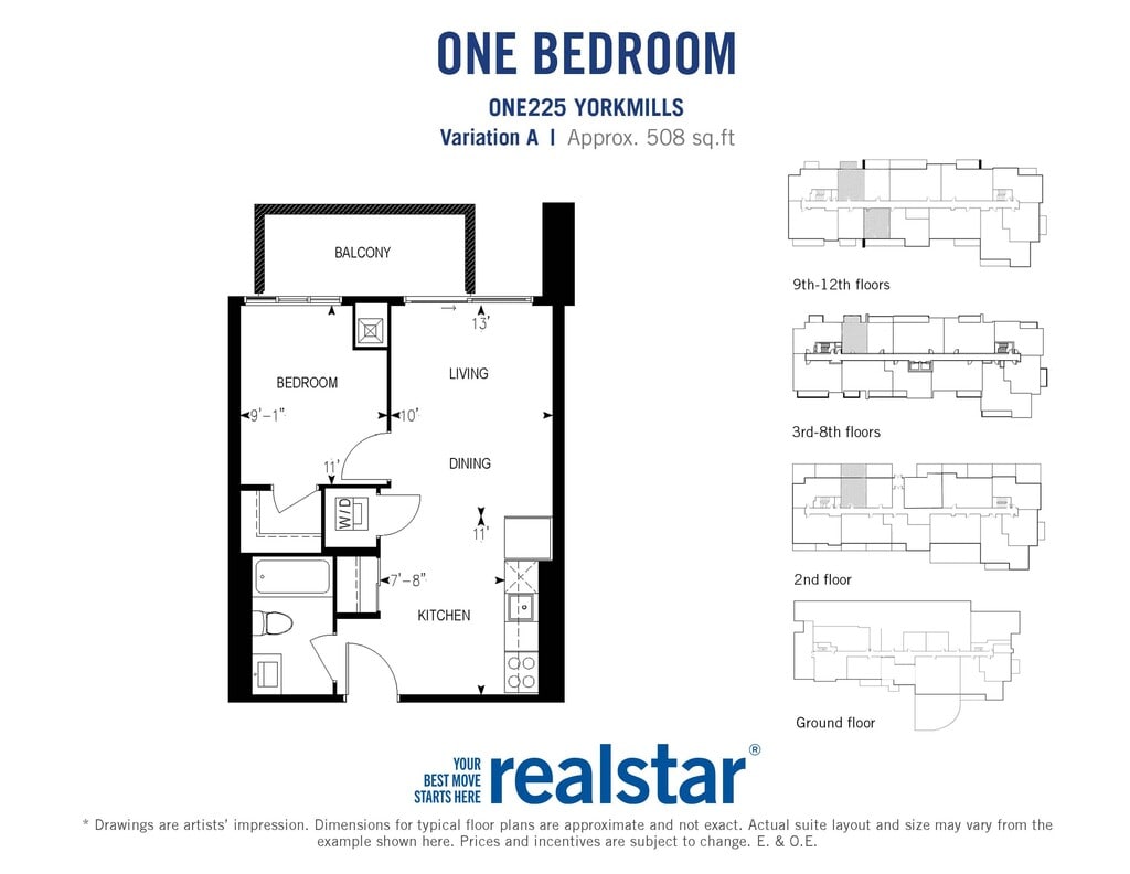 ONE225 York Mills offers 1 to 3 Bedroom apartments starting from C$2,000 and having 495–1,096 sq ft. Here is the current pricing and availability: