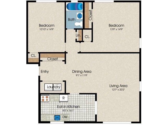 1 Bedroom, 1 Bath 880 sq. ft. - Floorplan 9 2 Bedrooms