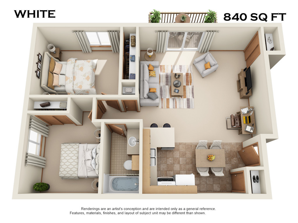 2 Beds, 1 Bath, 755-840 sq ftModel Gallery