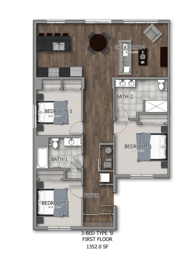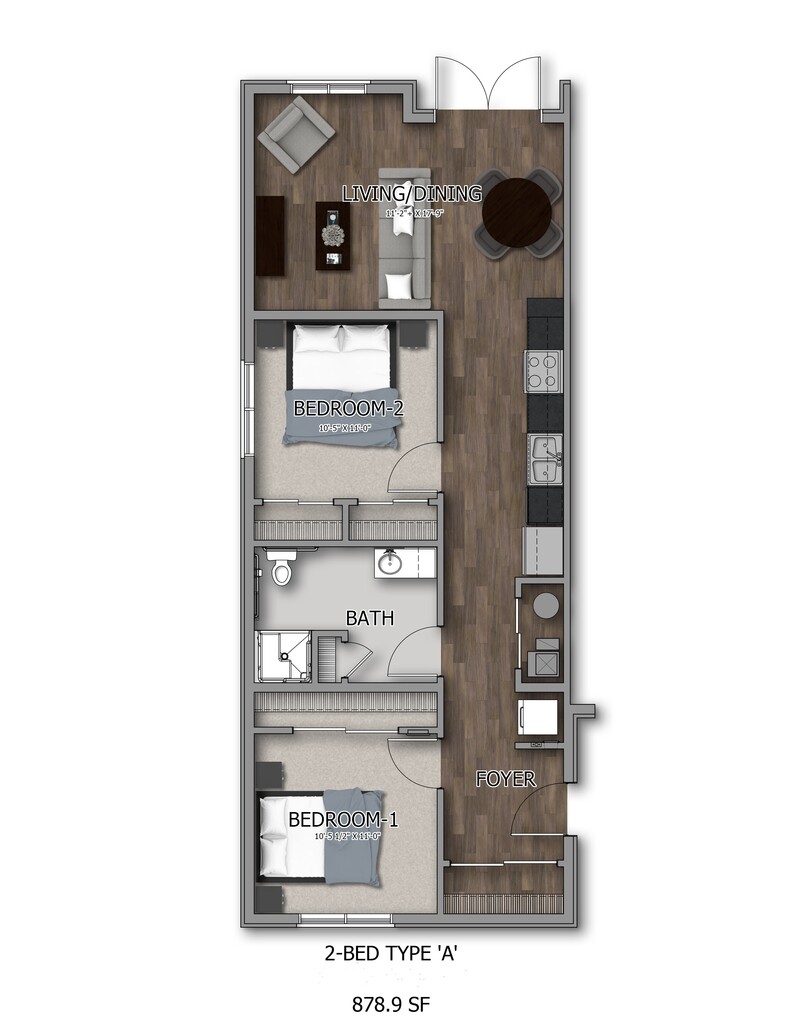 2 Beds, 1 Bath, 879 sq ftAvailable NowModel Gallery