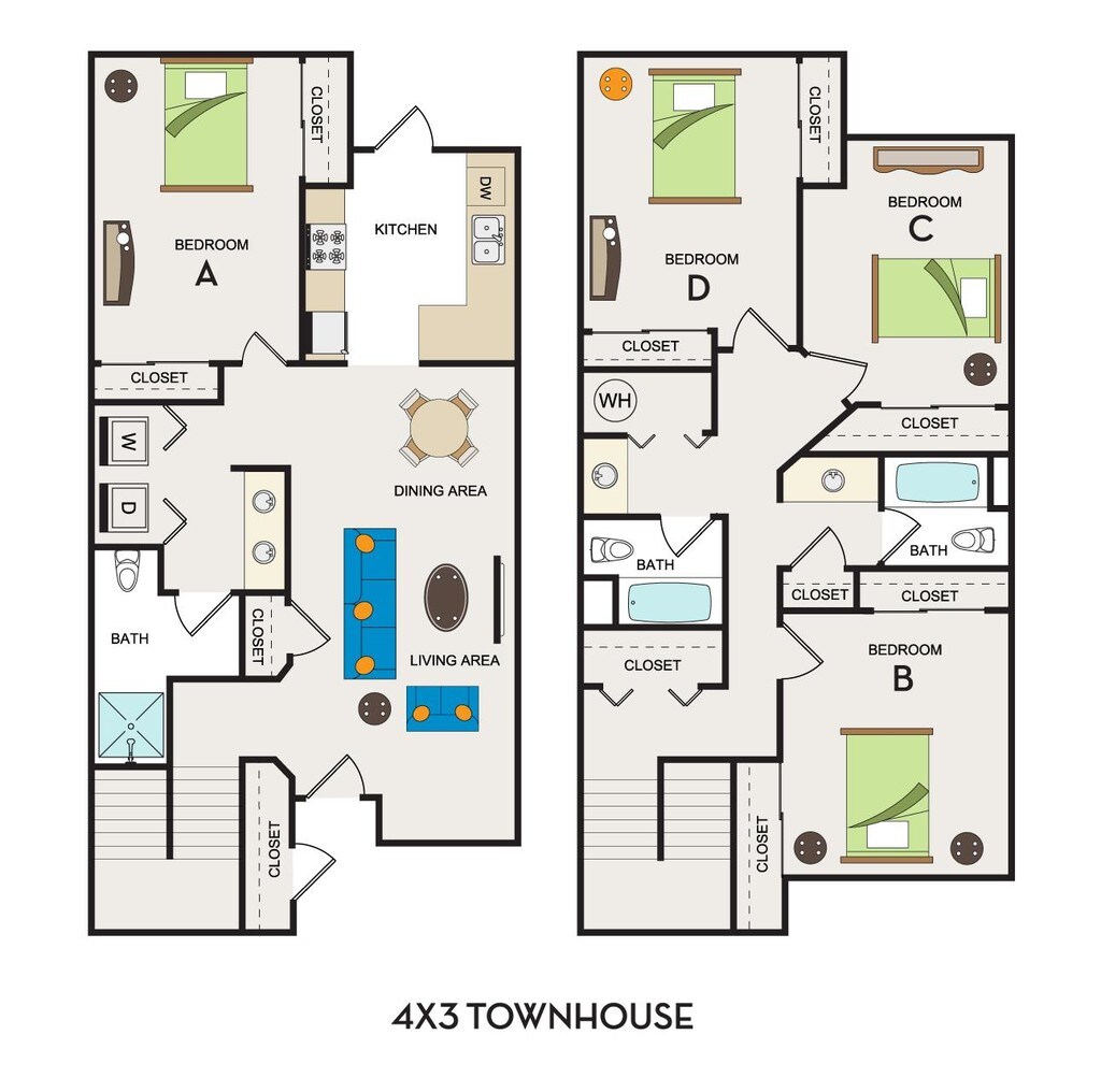 Apartment Model: 4x3 Townhouse Pricing Per Bed$1,1254 Bedroom, 3 Bath, 490 sq ftAvailable Now![]()