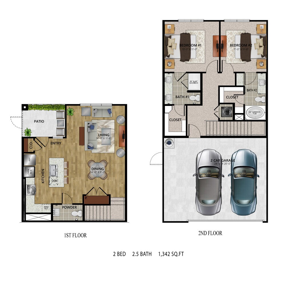 2 Beds, 2.5 Baths, 1342-1364 sq ftAvailable NowModel Gallery
