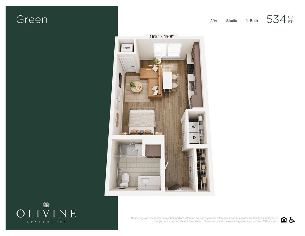 Green | ACC - Floorplan 2 Apartment Unit: 122Apartment Model: Green | ACC$1,595Studio, 1 Bath, 534 sq ftAvailable March 1, 2026Tamarack