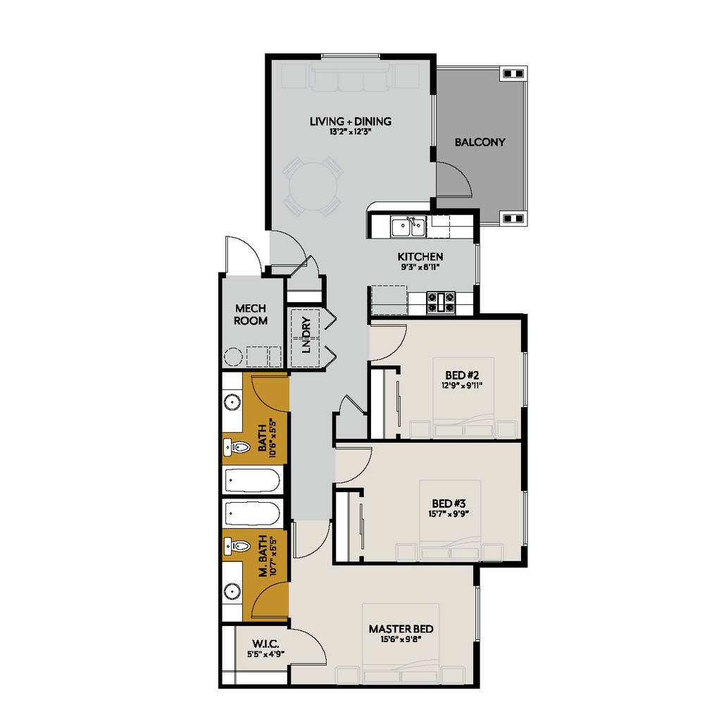 C2A - Floorplan 1 Apartment Unit: E201Apartment Model: C2A3 Bedroom, 2 Bath, 1026 sq ftAvailable January 10, 2026Floorplan C2B