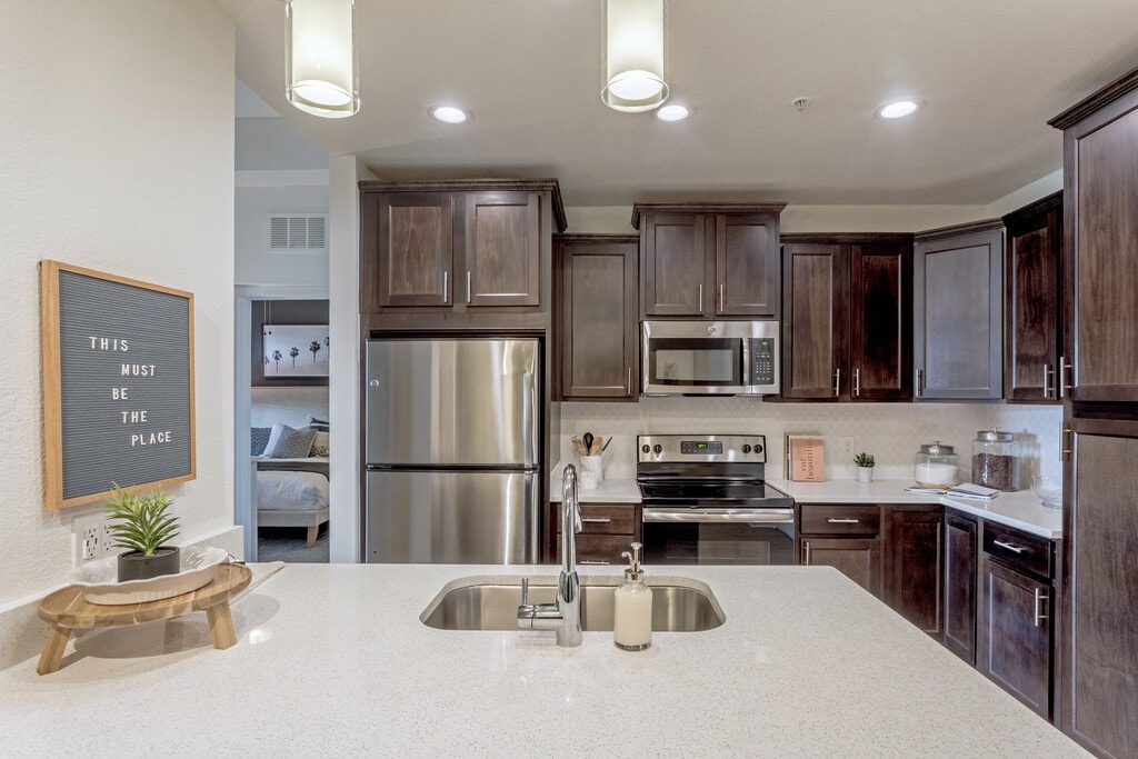 - Gourmet Kitchens with Stainless Steel Appliances, Quartz Countertops, and Wood Panel Cabinets