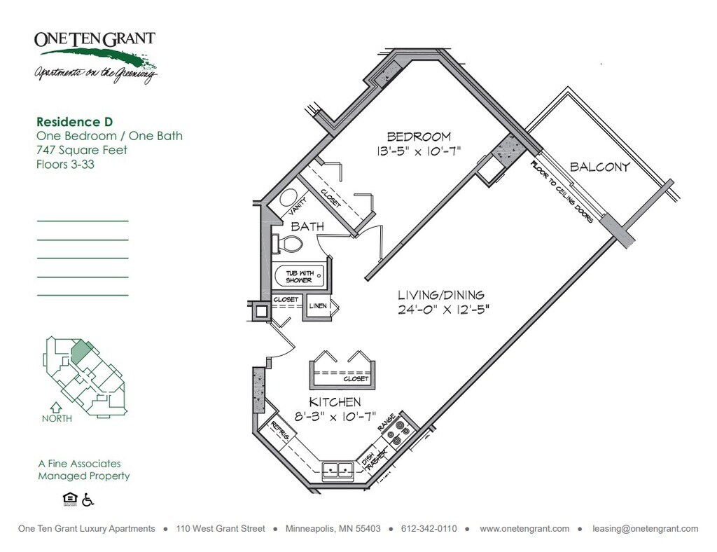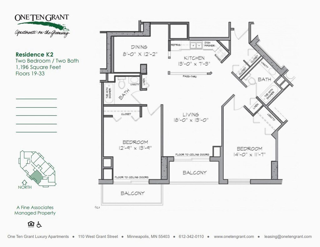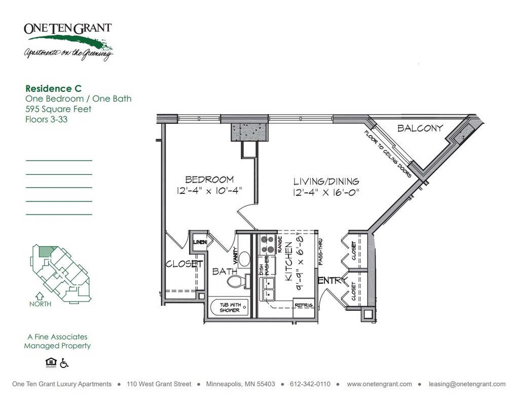 Situated on the edge of the beautiful Loring Greenway, One Ten Grant Apartments provides unparalleled convenience to work and leisure alike. Target Headquarters, Loring Park, Orchestra Hall, Nicollet Mall and The Walker Art Center are all within walking distance whether outside or through the Minneapolis Skyway System. Featuring newly updated kitchens with stainless steel appliances, laminate wood flooring, and counter tops all the apartments offer private balconies with views of Loring Park or the Downtown Minneapolis skyline. Our amenities include a large fitness center, spa, sauna and business center (all available 24-hours per day) along with an indoor/outdoor pool, complimentary continental breakfast and true 24/7 concierge service. Included with the rent are central heat and air-conditioning, water, trash, extended basic cable, and high-speed internet. Our professional staff is available for a private tour 7 days a week, call today! Please ask about our Preferred Employer Program for employees of Target Corporation, Ameriprise Financial, University of Minnesota and St. Thomas University and more!