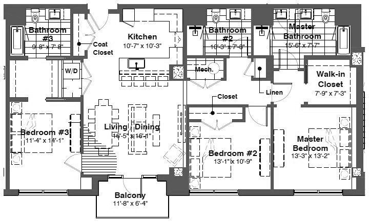 Apartment Model: Two Bedroom, Two Bath2 Bedroom, 2 Bath, 1154-1707 sq ftUnavailableTwo Bedroom, Two Bath - Floorplan 1 3 Bedrooms