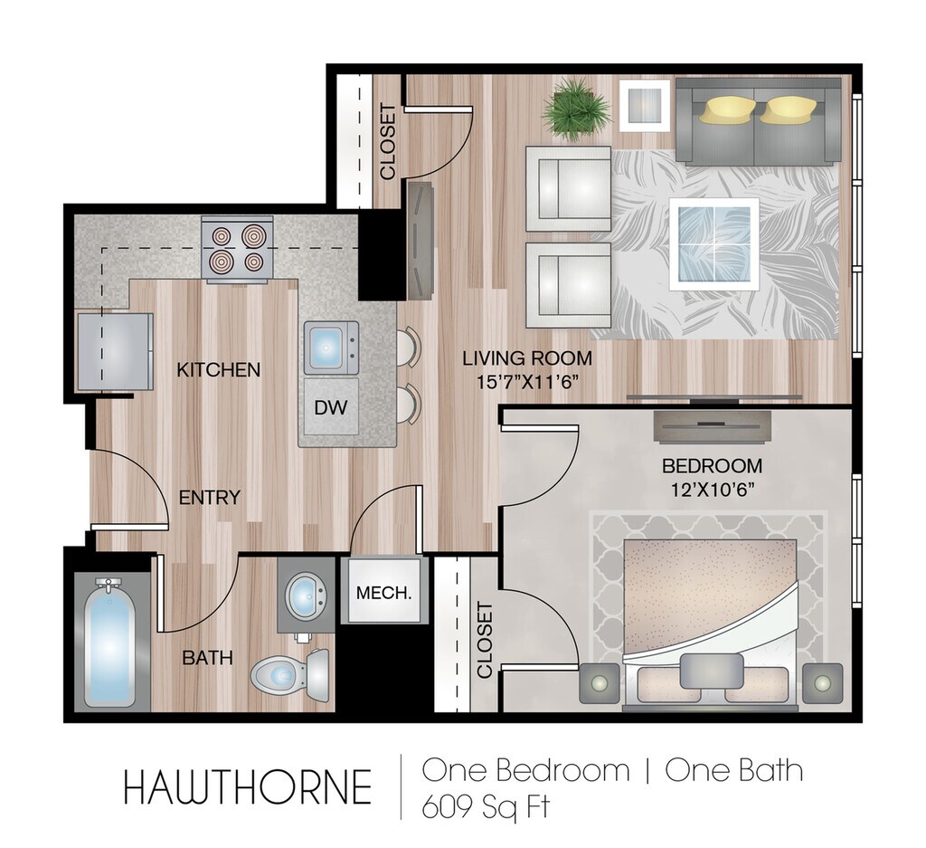 Hawthorne - Floorplan 1 Apartment Unit: 01-425Apartment Model: HawthorneFrom $2,3021 Bedroom, 1 Bath, 609 sq ftAvailable January 11, 2026