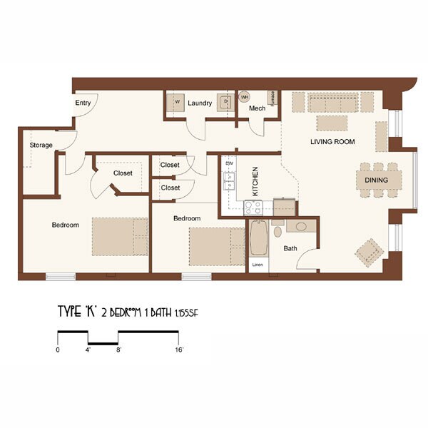 2 Beds, 1 Bath, 1298 sq ftLargest 2 BedroomThis is the largest 2 Bedroom at this PropertyModel Gallery