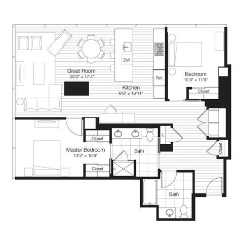 Apartment Model: Tower 13Studio, 1 Bath, 597 sq ftAvailable Now![]()