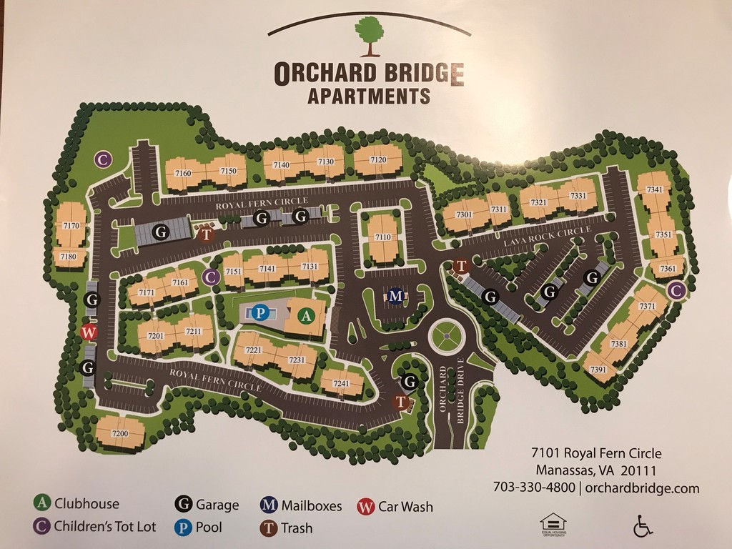 Orchard Bridge Apartments is a 368 Unit, Four Story Garden Style Apartment Community. This is luxury living at an affordable price! This beautiful and quiet community is tucked away, backing to the Bull Run River and overlooking back to serene forest views. Orchard Bridge is located on the outskirts of Manassas/Prince William County, neighboring Centreville in Fairfax County, Virginia. The Community is right off of Centreville Rd (Rt. 28) and we are just minutes away from I-66 and Rt. 29. Current Amenities: 3 Tot lots; available year round and an outdoor heated pool; available between April - September. Parking: Free, Open Parking Surface Lot (2 Spaces Per Unit) and optional Detached Garages available for $68, $99 or $125/month.